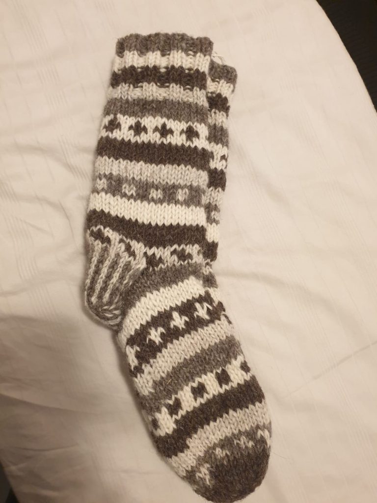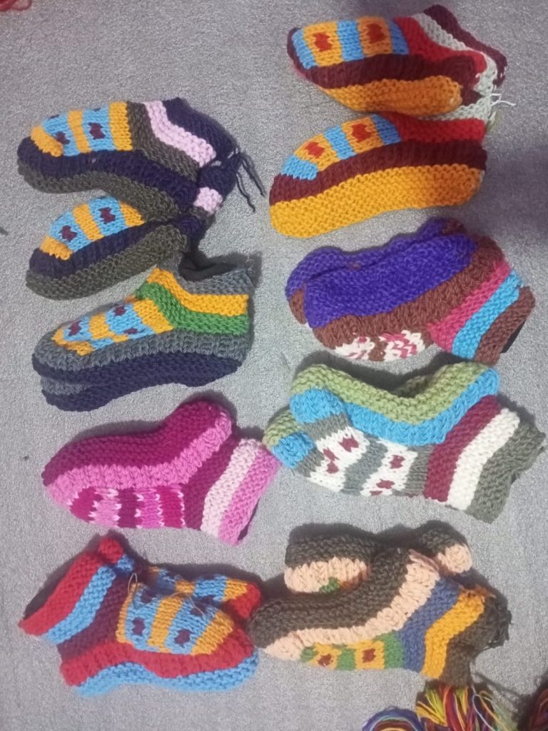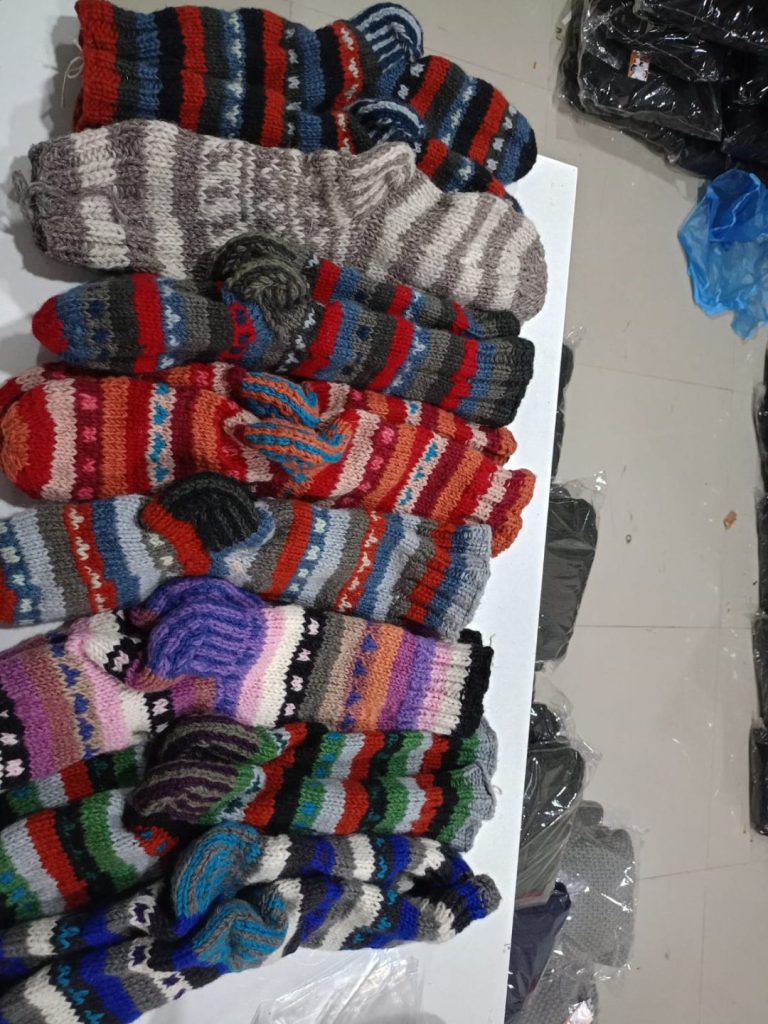 #SH-NP-0010 #100% Organic Wool Long Socks Art work Hand Knitted with warm Lining inside Natural dye colors use. One Size in Natural Colours We started supporting the Women's Group in Village Nepal financially. They get Support for Kids' education and Families to have a better life