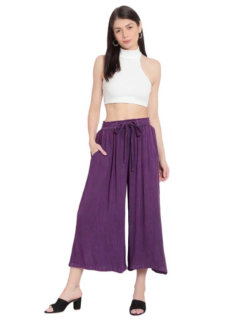 Item Code #019-003 Travel Trousers Palazzo Wide with Belt Style Rayon Bamboo design made Free Size fit Size S to XXL from European design. Trousers have elastic that makes adjusts to sizing.100% natural dye colour used, made in India, AZO free, which means there is no chemical in the fabric. Please ask for the price and choice of 14 Solid good colors available