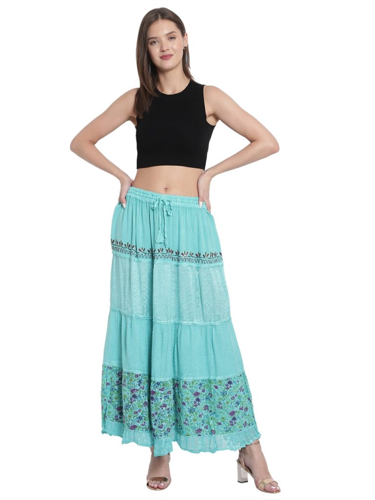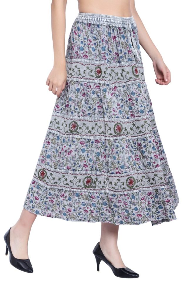 #Item Code #023-006 Skirts 100% Rayon Bamboo 4- Border Print design from European design made Free Size Fit S to XXL.Hand Natural Dye Colour Used Made in India AZO Free Means No chemical in Fabric Natural Dye Colour Used Please ask for the price and choices of 12 Fall Colours.